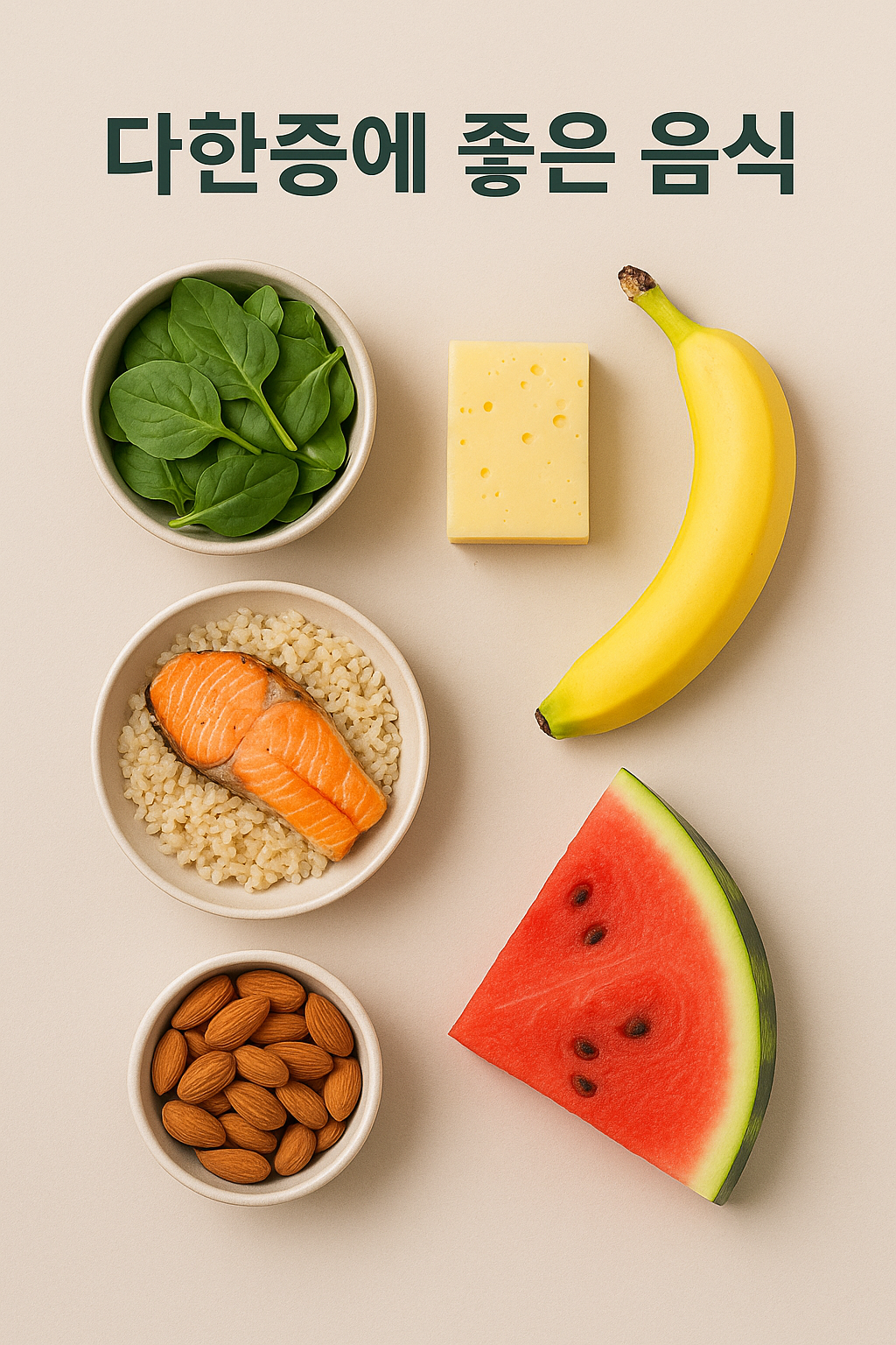 대표 음식: 시금치, 케일, 아몬드, 바나나, 해바라기씨, 두부