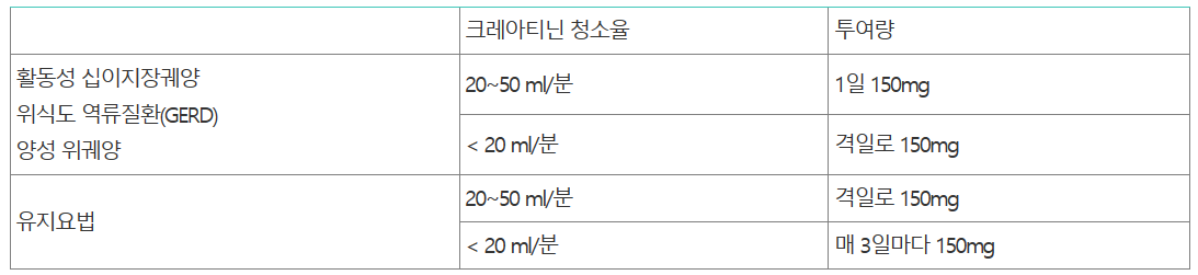 성인은 십이지장 궤양 치유 후 1회 150mg을 1일 1회 취침 시에 경구투여합니다. 치료는 1년까지 계속될 수 있으며, 그 이상의 장기투여에 대한 결과는 알려져 있지 않습니다.