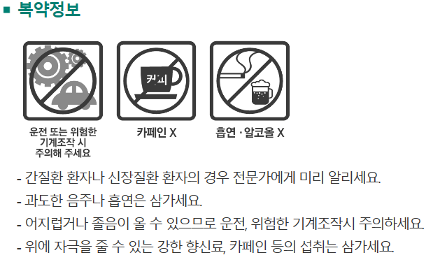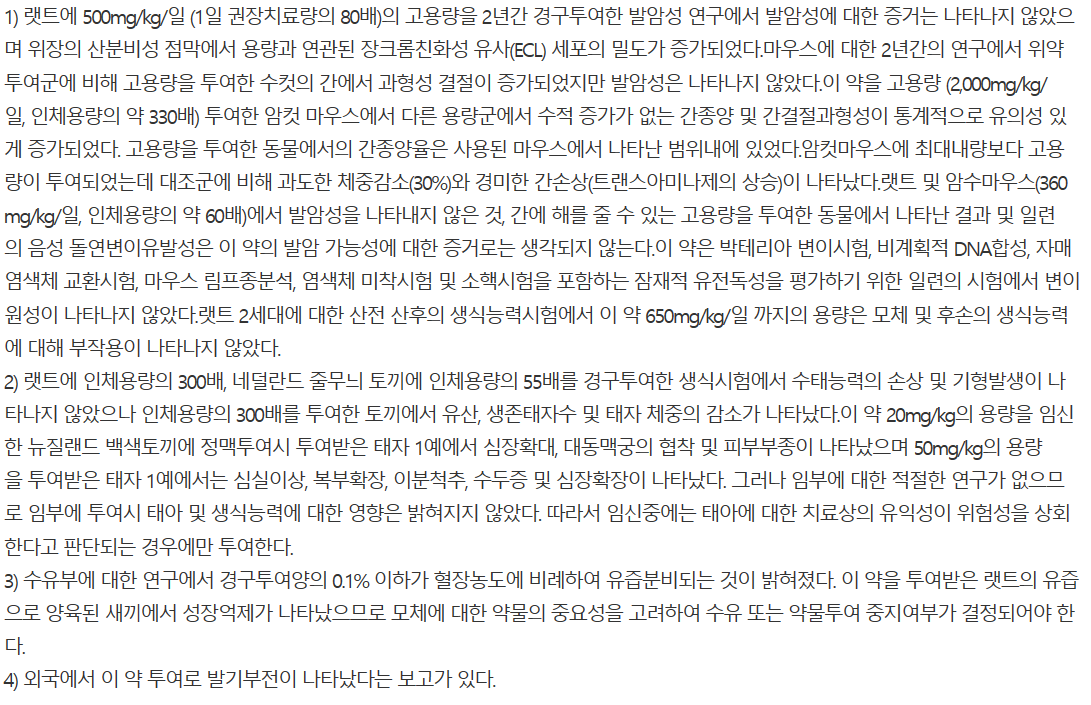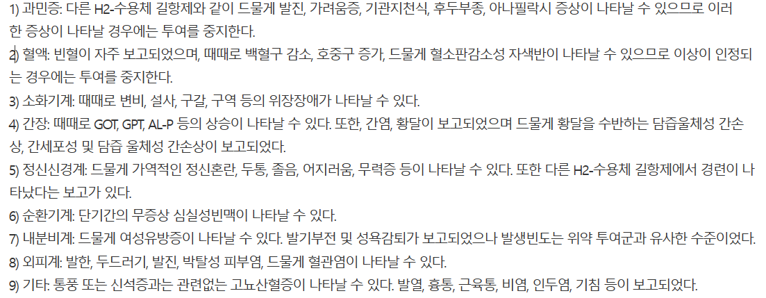 - 위암의 증상을 은폐할 수 있으므로 악성이 아닌 것을 확인한 후에 투여해야 합니다.