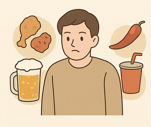 튀김류, 육류, 고추, 마늘 등은 위 점막을 자극해 소화불량을 유발할 수 있습니다.