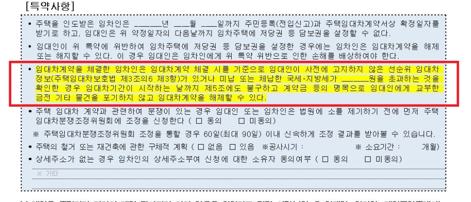 표준계약서에는 임대인이 제시한 정보가 사실과 다를 경우 임차인의 계약 해제 특약 규정을 넣었습니다. 임대인이 사전에 고지하지 않은 선순위 임대차 정보(확정일자 정보 등)나 미납·체납한 국세·지방세가 있다는 사실이 확인된 경우, 임차인은 위약금 없이 계약을 해제할 수 있도록 하는 특약사항 체결을 권고합니다. 즉 임차인이 임대차계약 체결 시 위 표준계약서에 따른 특약사항을 기재한 경우에는 고지받지 못한 선순위 임대차 정보 및 임대인의 체납사실 등이 밝혀지면 임대차계약을 해제할 수 있기 때문에 전세사기피해를 예방할 수 있습니다.