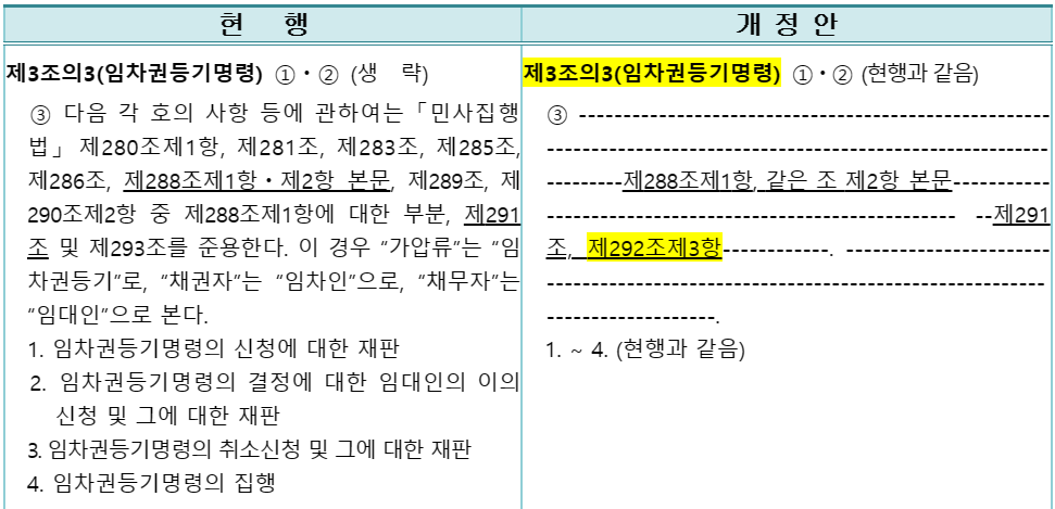 임차권등기명령제도는 임대차 종료 후 보증금을 반환받지 못한 임차인에게 단독으로 임차권등기를 경료할 수 있도록 함으로써 자유롭게 주거를 이전할 수 있는 기회를 보장하기 위한 제도입니다. 주택임대차보증금의 경우 보증금 선순위를 확보하려면 전입신고를 하고 확정일자를 받아야 합니다. 즉 둘 다 해야 합니다. 그러나 이미 이사는 갔고, 전입신고를 해야 하나 전입신고를 할 경우 선순위에서 배제되니 임차인은 이러지도 저러지도 못하는 상황입니다. 그래서 임차인은 법원에 임차권 등기 요청을 하면, 법원에서 결정을 하고, 법원의 결정이 임대인에게 고지되어야 임차권을 등기할 수 있었습니다. 그러나 임대인은 임차권 등기가 되길 꺼리기 때문에 송달회피하거나, 임대인의 주소가 불명확하거나, 사망했을 경우 송달이 어려워 등기를 할 수 없었습니다. 이러한 문제점을 해결하기 위해서 가압류 집행은 채무자에게 재판을 송달하기 전에도 할 수 있다는 민사집행법 제292조 제3항을 준용했습니다. 즉 임대인에게 송달이 되지 않더라도 임차권을 등기할 수 있도록 변경된 것입니다. 이젠 보증금을 돌려받지 못했더라도 자유롭게 전입신고를 할 수 있도록 법이 개정되었습니다. 또한 임차인의 보증금반환채권 보호를 강화하였습니다. 등기에 명시되었으니까요!
