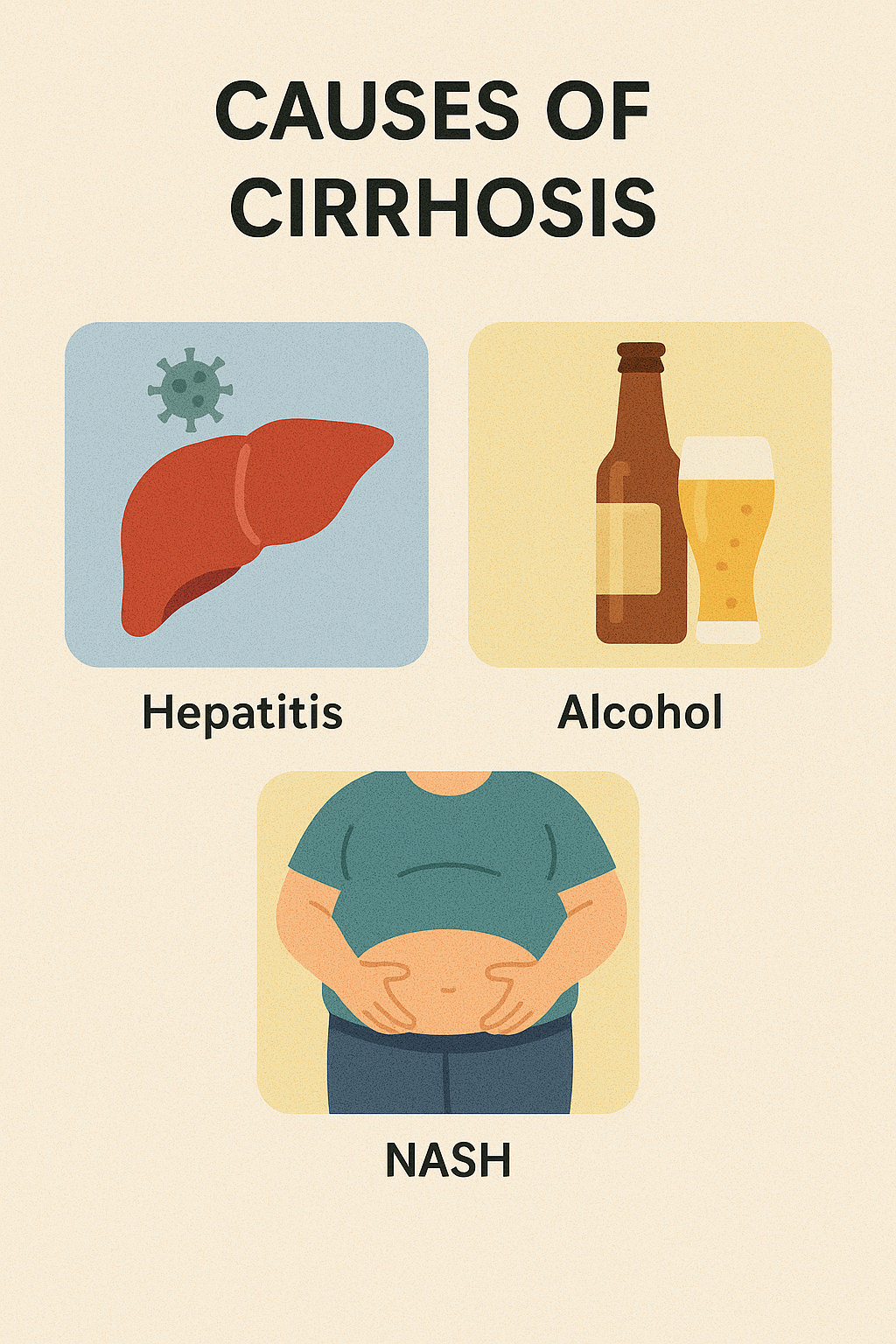 간경화는 여러 가지 원인에 의해 발생할 수 있으며, 대표적으로 다음과 같은 요인들이 있습니다.